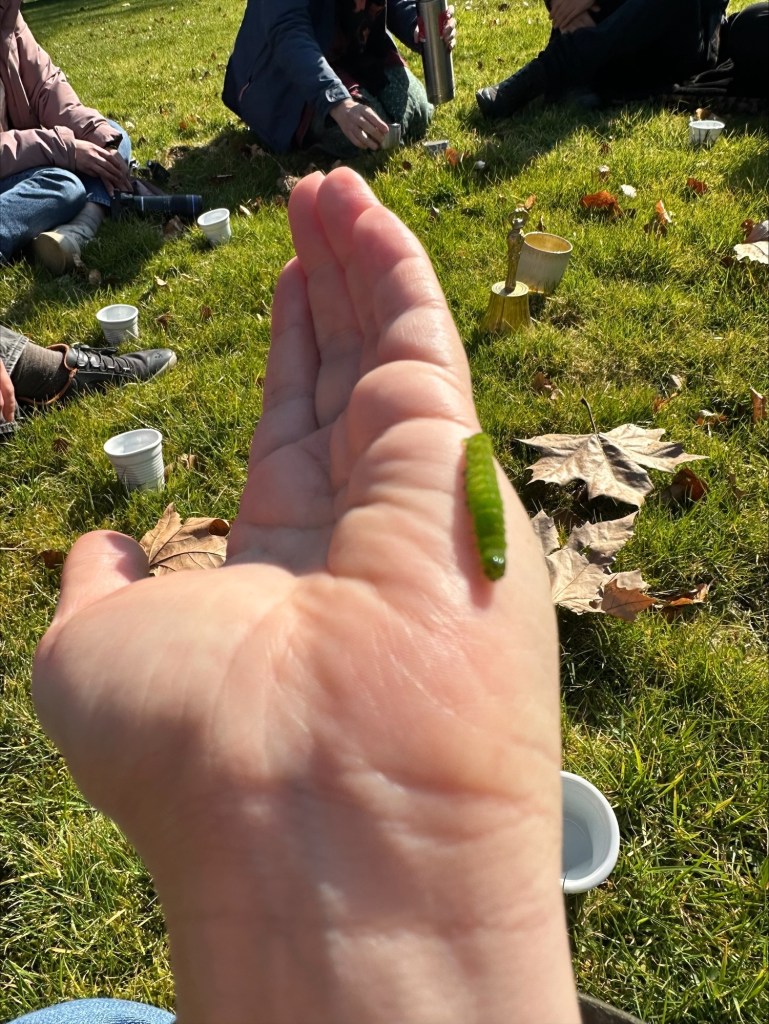 During one poignant moment, a caterpillar, perhaps mistaken for a grass snake, was passed around in a circle of human participants. When it landed on my hand, it sought refuge inside my sleeve. This sparked a conversation about the caterpillar’s instinct to hide in the dark, reflecting broader themes of concealment and protection. We discussed the inevitability of death for insects and how trees that spread pollen are at an advantage, hinting at a possible resurgence of coniferous trees. With the decline of insects, we pondered a future where colors fade from the plant kingdom, as they no longer need to attract pollinators.