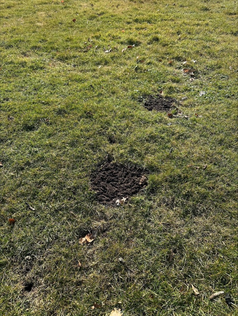 I continued to walk; it would be a short half-hour walk. I noticed molehills, the traces of underground creatures. There was so much activity underground; soon everything would bloom. I passed some digging work, next to overgrown fields, a bulldozer.