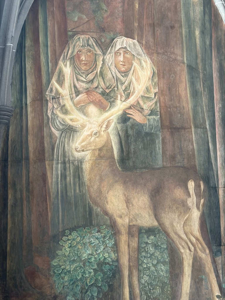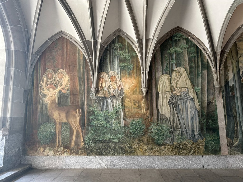 Artemis. Yes, I could feel her presence. In one small alley, I sat in the shade in front of a mural. Tourists passed by, often Spanish-speaking guides explaining the sites. I let myself pause. According to legend, two sisters, Hildegard and Bertha, daughters of a nobleman, lived in a fortress high in the mountains above Zürich. Each evening, a deer with glowing antlers would appear and guide them safely through the dark forest, down to the banks of the River Limmat. There, at the water’s edge, the sisters would pause to pray, before the mysterious stag led them back home through the woods. Interpreting this as a divine sign, the sisters believed that a religious foundation should be established on that very spot. Their father eventually agreed, and a monastery for aristocratic women was founded, with Hildegard becoming its first abbess.