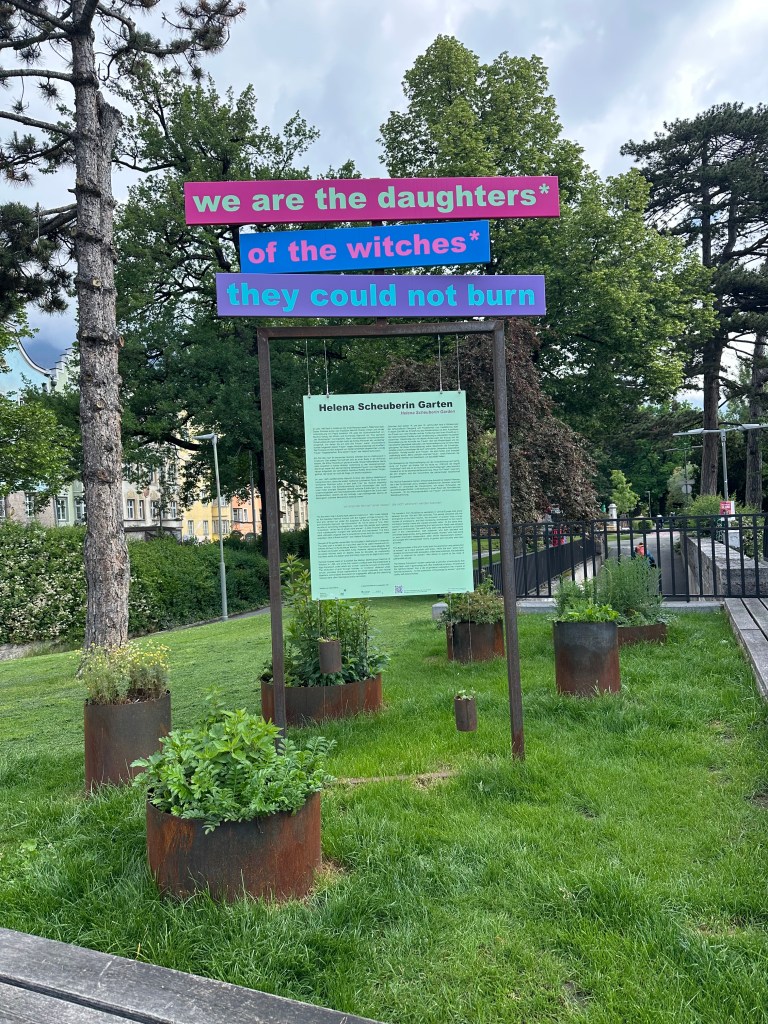 I lingered there for a while, staying close to the plants—recognizing the powerful raspberry plant among others—before catching my bus. The Helena Scheuberin Garden features a selection of local plants traditionally used in gynecology and other medicinal practices. It reclaims the “witches’ kitchen” from a site of gendered persecution and transforms it into a space of feminist autonomy—a place where women’s knowledge, once criminalized, is again cultivated and celebrated.
