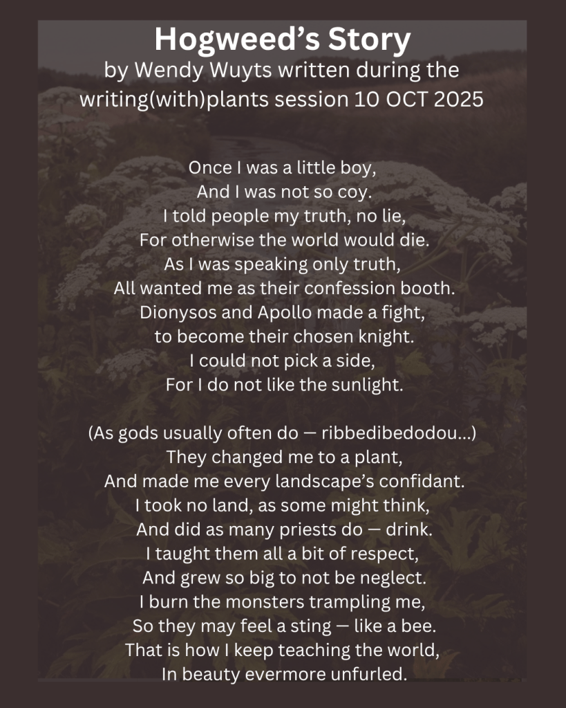After Vitalija Povilaityte-Petri, one of the co-founders of writing(with)plants, representing a bigger collective did a session on the Dose Symposium foregrounding the hogweed, there was a fascinating email exchange between some of us..