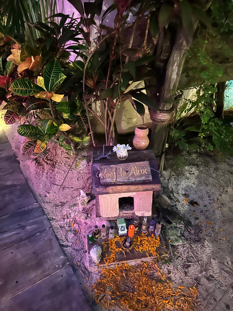 When I gazed out of the bus window, I saw some mini temples close to the construction of a bridge, or next to a busier road. I could not take pictures of these. In my eco-tourist hotel in Tulum, I also saw a little casita with offerings, and the hotel manager indeed told me it was for the Aluxes. The Alux houses (casitas) are often small clay houses built for them, usually with offerings, to gain their favor and secure their protection, as seen in construction projects such as the Cancún–Nizuc bridge. Traditional offerings include sakab (a sacred corn drink), sweets, tobacco, or food, with rituals performed to ask for blessings and permission to enter sacred areas. The way they build these offerings reminded me of small spirit houses in Thailand. In the new museum in Jaguar Park in Tulum, there was also an Alux statue where you could offer some coins.