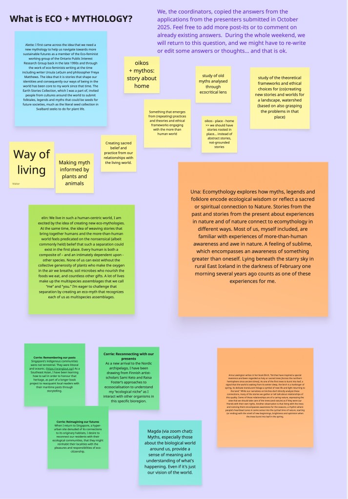 I walked participants through several MiroBoard frames, including one on relationscapes, inviting everyone to introduce themselves through place and three relationships with the more-than-human world. On my own post-it, I wrote: Wendy, currently rooting in Norway, in relation with Lake Mjøsa, spruce trees, and mysterious huldra stones.