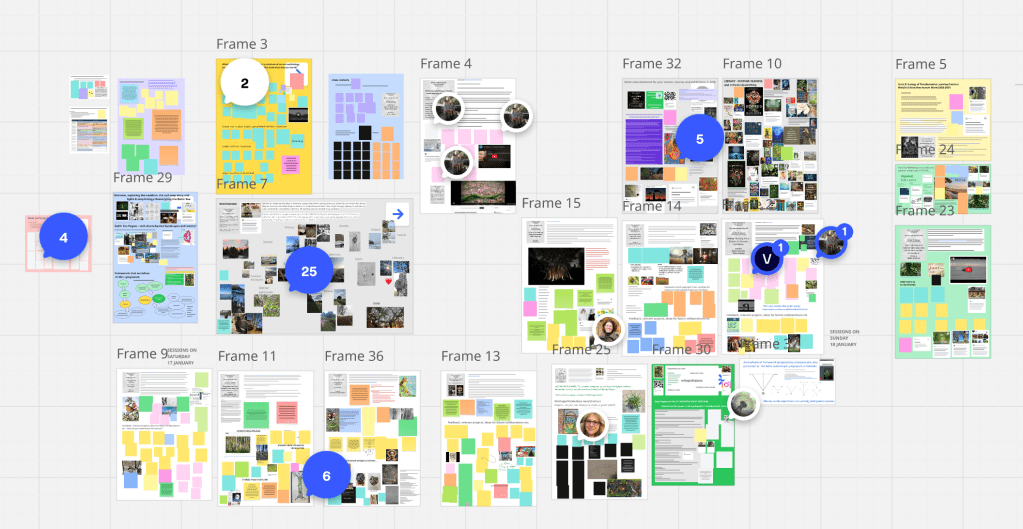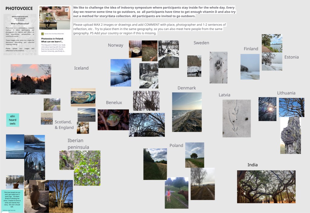 After this session, participants were invited outdoors for a photovoice exercise: take one or two photographs of your place, reflecting on what eco-mythology could mean there. We created a MiroBoard frame for uploading images and notes.