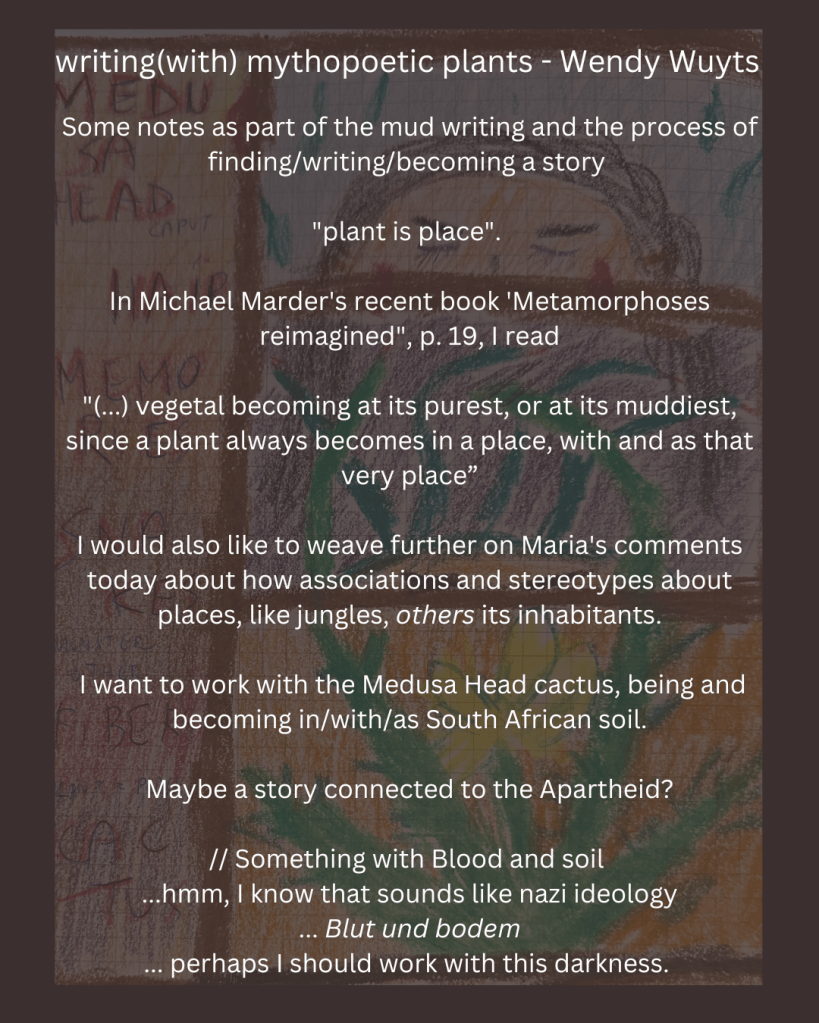 When a participant had to cancel her session during our Eco+Mythology symposium, we decided to host a writing(with) Medusa Head session once again. It is always fascinating to observe what unfolds when we invite the same guest plant back into the space, this time with a different group of people. Lisa worked with the same slides as before, making only very small changes.