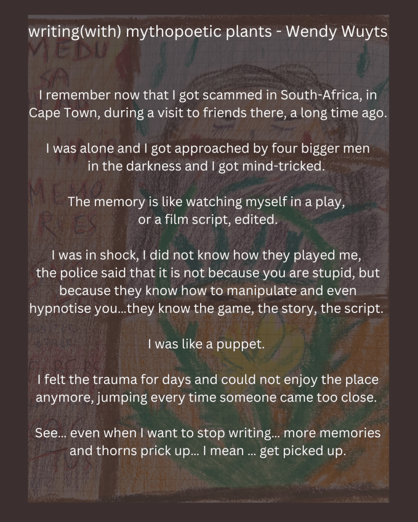 Around ten participants joined the session, connecting from Canada, the USA, Latvia, and Denmark, alongside the familiar co-creators and initiators Vitalija and Heide, and Alette Willis (from Restorying the Earth), who will host her first writing(with) plant session in February, with tree mallow as the guest plant.