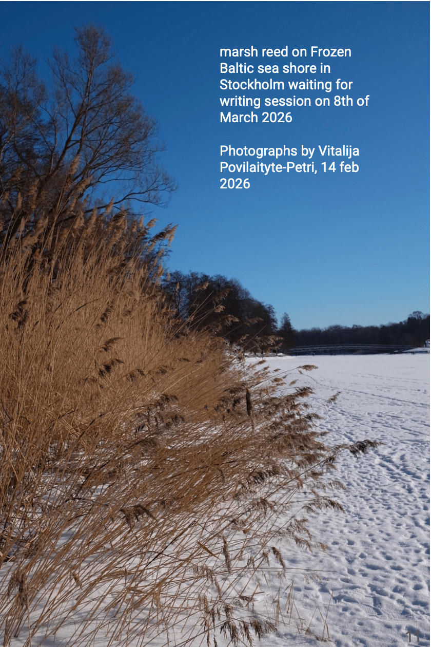 In the final ‘forum’ moment, several participants shared texts and reflections. One poetic piece described reeds standing in a northern wetland at the end of winter, filtering wind and water while providing shelter for animals and participating in seasonal cycles leading toward spring. Another piece portrayed a plant growing near a river, sensing wind, birds, and hidden water sources. The text reflected on the plant’s changing status, from once being valued as a food source to now being labeled an “invader.”