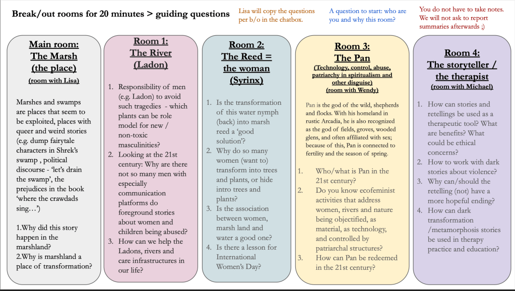 In one of the breakout discussions, participants explored under guidance of Lisa Sattell why marshlands and wetlands appear so frequently in stories. Thanks to the recent publication by Rick Dolphijn and Irena Chawrilska “On the Femininity of the Swamp. Reading the Monstrous Garden of Fertility, Fermentation, Decay” and their keynote during the ecomythology winter symposium 2026, we had already rich material to prepare this break out room.