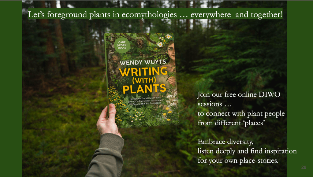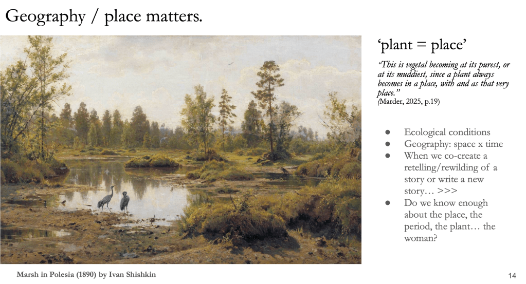 For this session, I created a few more slides, to even emphasize the role of place, how it shapes the plant becoming and constant metamorphosis. In the chapter that we selected from Michael’s book (all registered participants got a PDF from the two-page chapter beforehand), he wrote a beautiful quote about how plant is place.