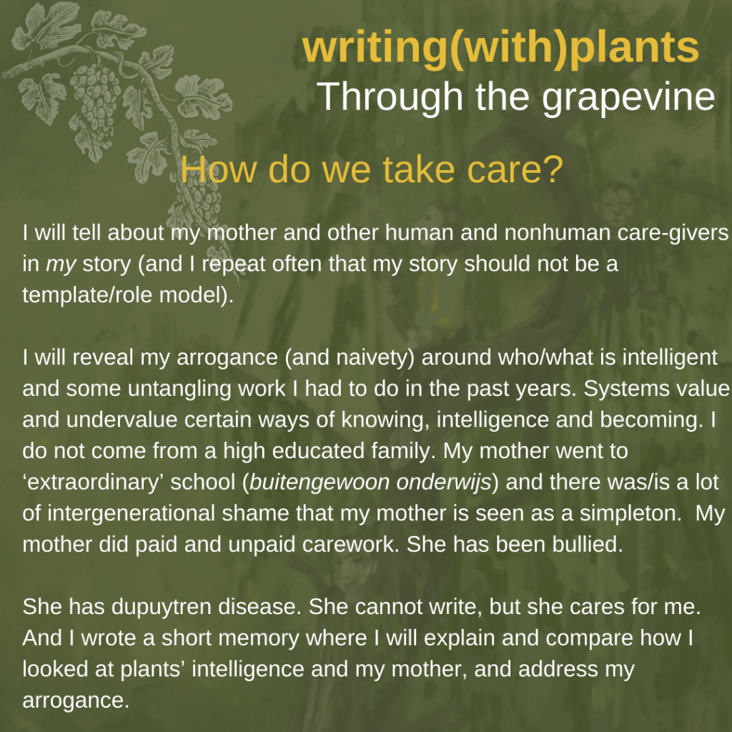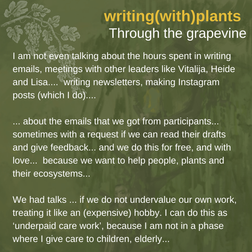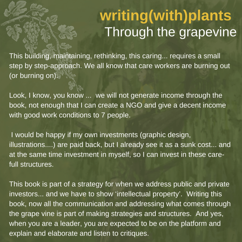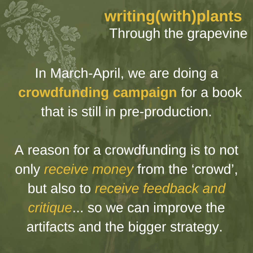 This blogpost is part of the creative process of the upcoming writing(with)plants care(work)book. Currently we do crowdfunding (until April 17th, check here), which means that we are receiving money from backers, but that we are also open for receiving feedback and critical questions.