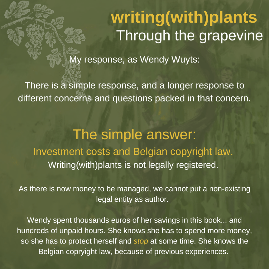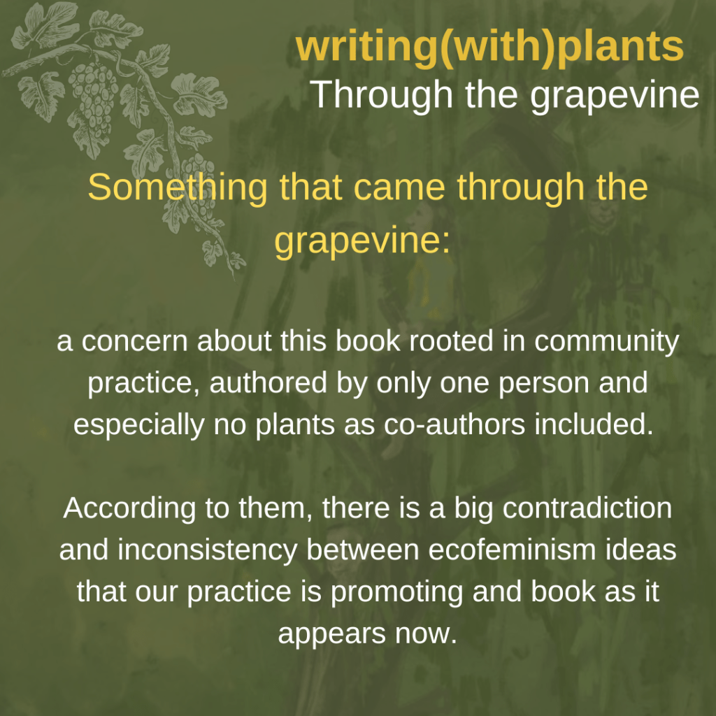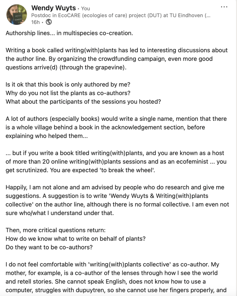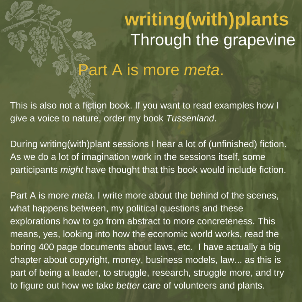 This blogpost is part of the creative process of the upcoming writing(with)plants care(work)book. Currently we do crowdfunding (until April 17th, check here), which means that we are receiving money from backers, but that we are also open for receiving feedback and critical questions.