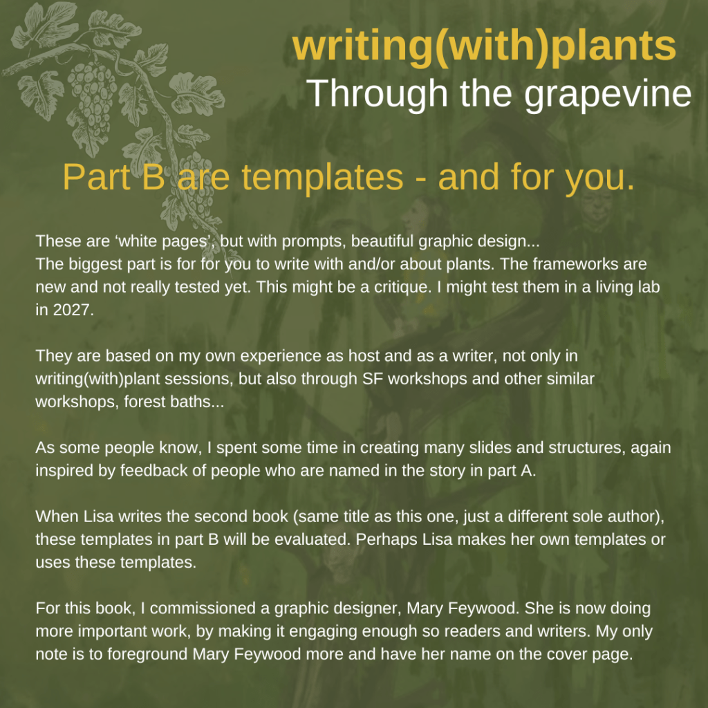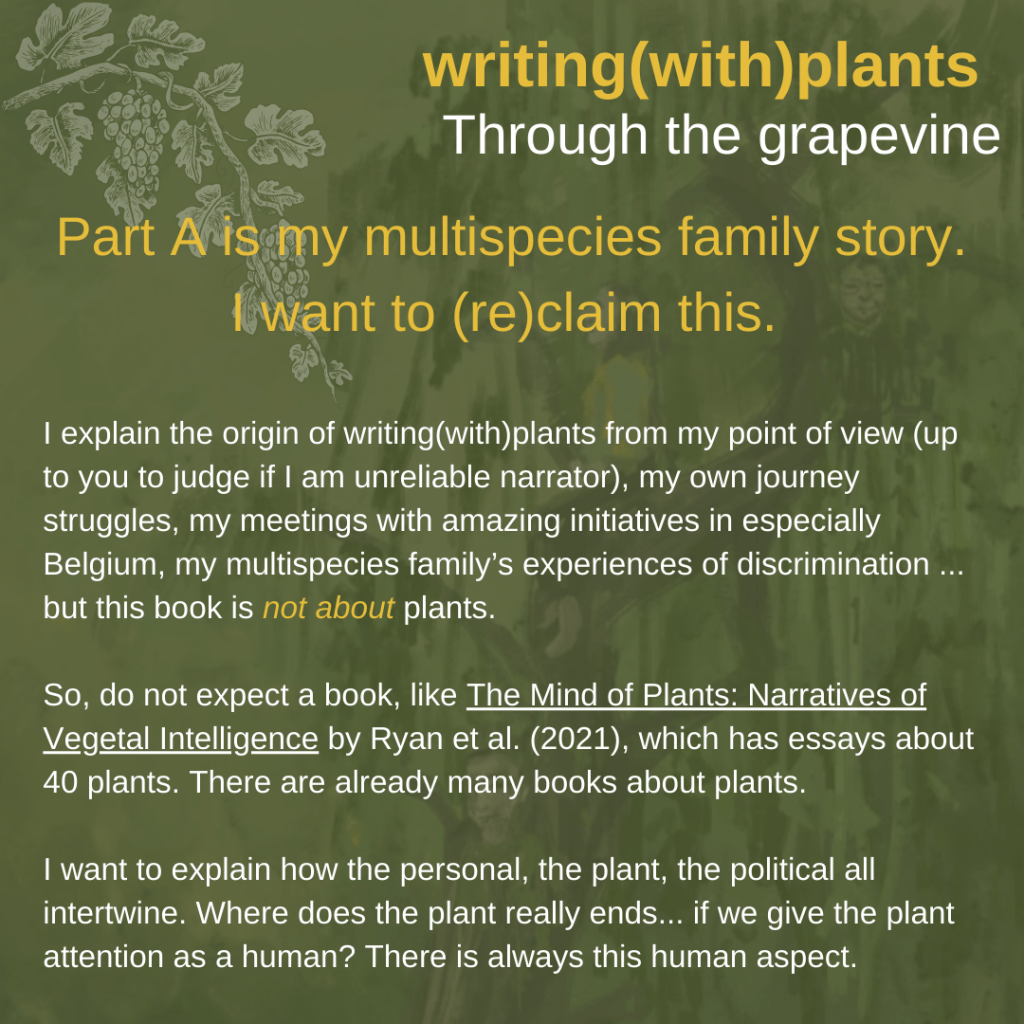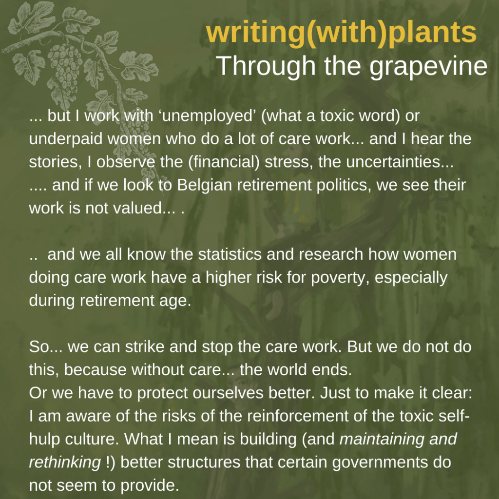 A small note. Sometimes … things come back. When I was playing with the idea of ‘hearing gossips, critiques…’ through the grapevine, I had to think about the book Gossip from the Forest: the Tangled Roots of our Forests and Fairytales by Sara Maitland. I read that book in 2029/2020, and this is one of the books that inspired me to write something similar for Flanders and the Low Countries. Gossips of the Forest are a bundle of retellings of folktales – for each month-, connected with an essay about a walk or forest bath in a British landscape. Writing(with)plants care(work)book: As told to the author by a Voice… includes parts that I started to draft for that book. Her retelling ‘”The Dreams of the Sleeping Beauty” (for the February chapter) is one of my favorite short stories ever. When I was invited by EarthWise Education in Belgium (educational center for ecopsychology and ecophilosophy) to give an online lecture about eco linguistics, this was the story I selected to read aloud.