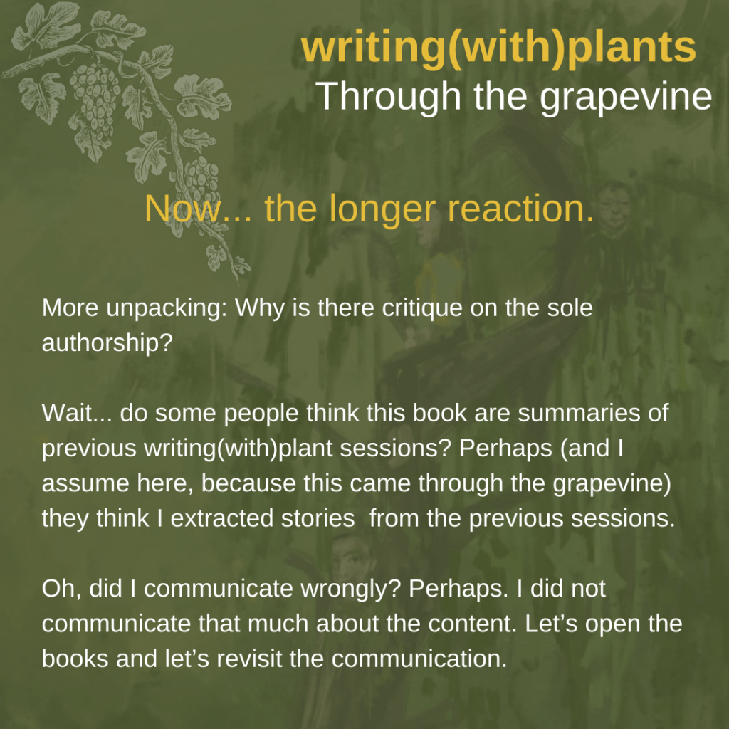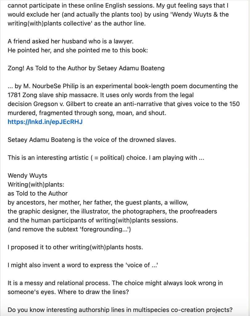 This book is still in pre-production, but I am learning and reflecting a lot. However, sometimes it is very overwhelming and it is not always comfortable to be in defending modus. The other leaders and I identified that writing(with)plants is becoming something bigger, so this means having talks about a governance model, clear roadmaps etc… will be an important phase. We are all living in places with spring energy, so now it is time to grow, to adjust and observe at the same time.